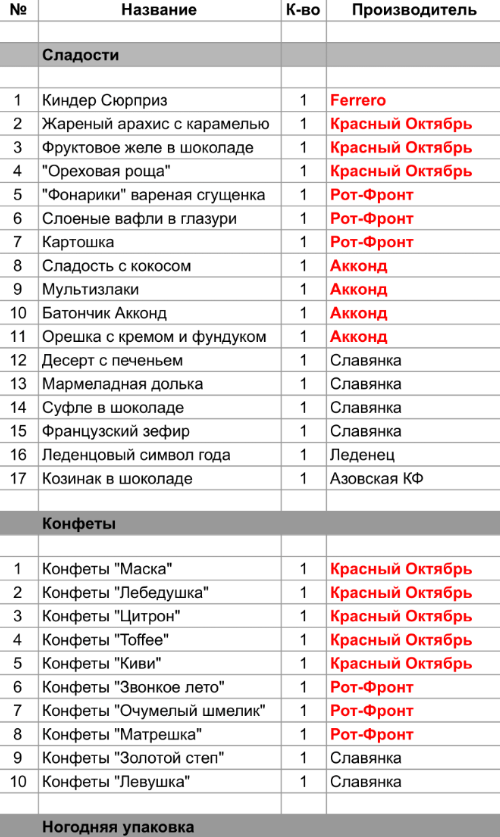 "Фонарики" вареная сгущенка (1 шт), Слоеные вафли в глазури (1 шт), Картошка (1 шт), Конфеты "Звонкое лето" (1 шт), Конфеты "Очумелый шмелик" (1 шт), Конфеты "Матрешка" (1 шт)